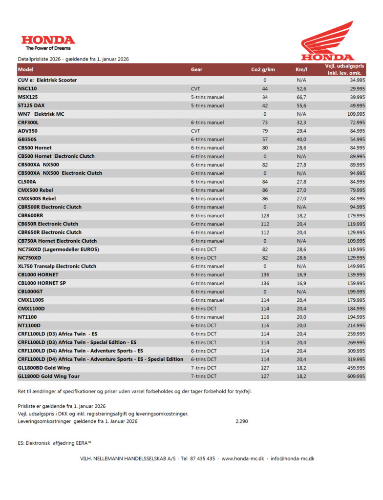 Den danske Honda-importør løfter nu sløret for 2026-programmet og -priserne. I store træk er priserne uændrede fra 2025, men der er et par undtagelser: GB 350 S stiger med 5000 kr. til 54.995 kr., og NC 750 XD stiger med samme beløb til 129.995 kr.