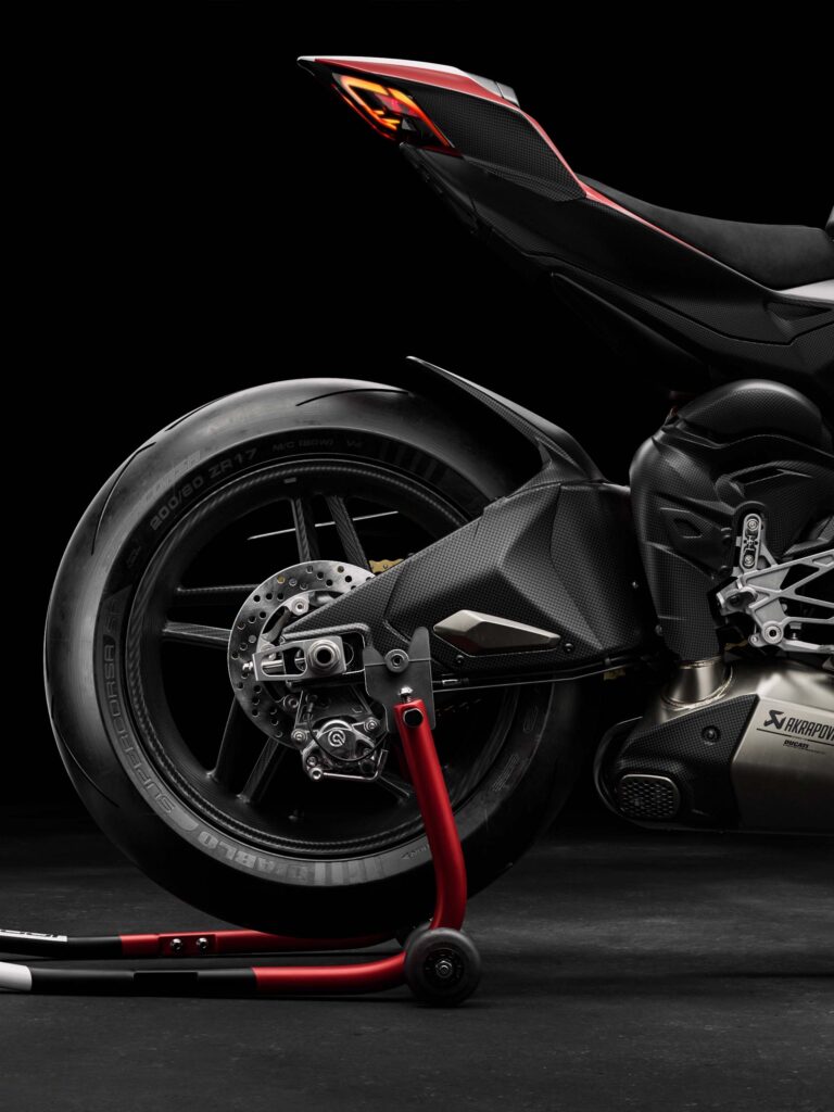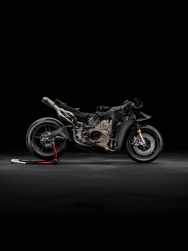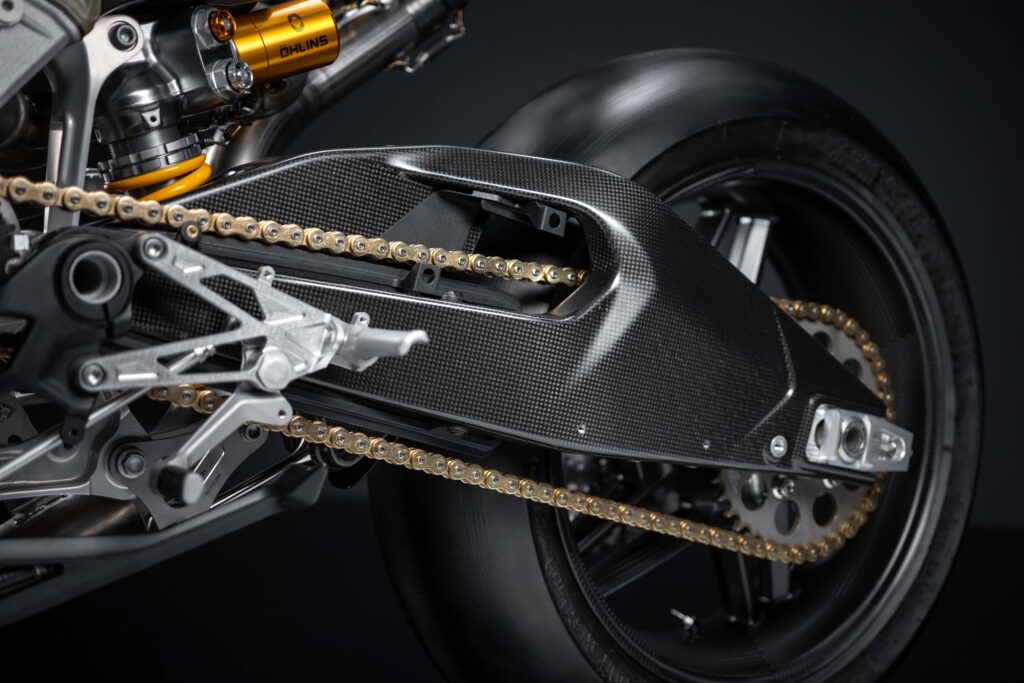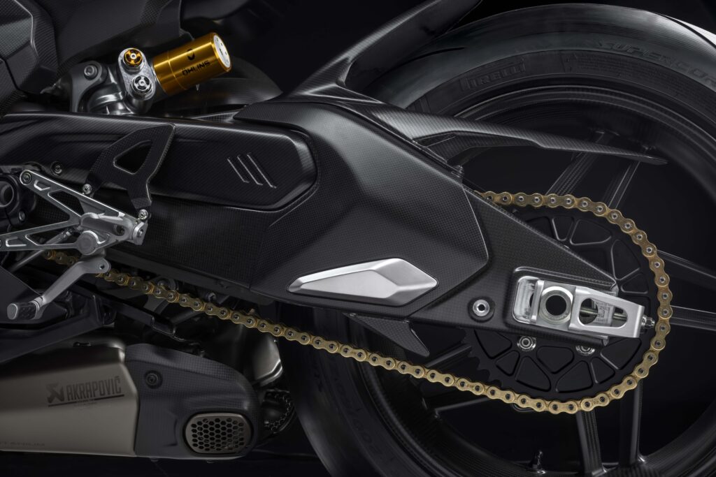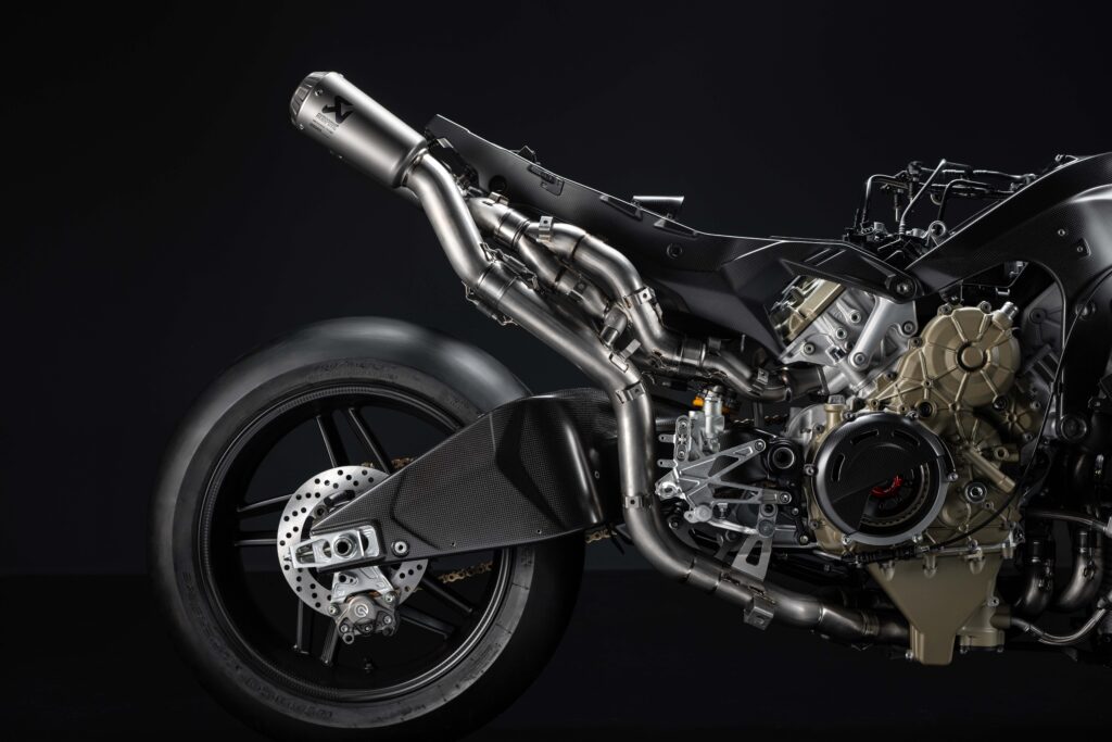 V4-motoren på 1103 kubik yder 228 hk, men ydelsen kan løftes til 247 hk med en racerudstødning fra Akrapovic, som samtidig sænker den køreklar vægt uden benzin fra allerede fjerlette 173 kg til 167 kg.