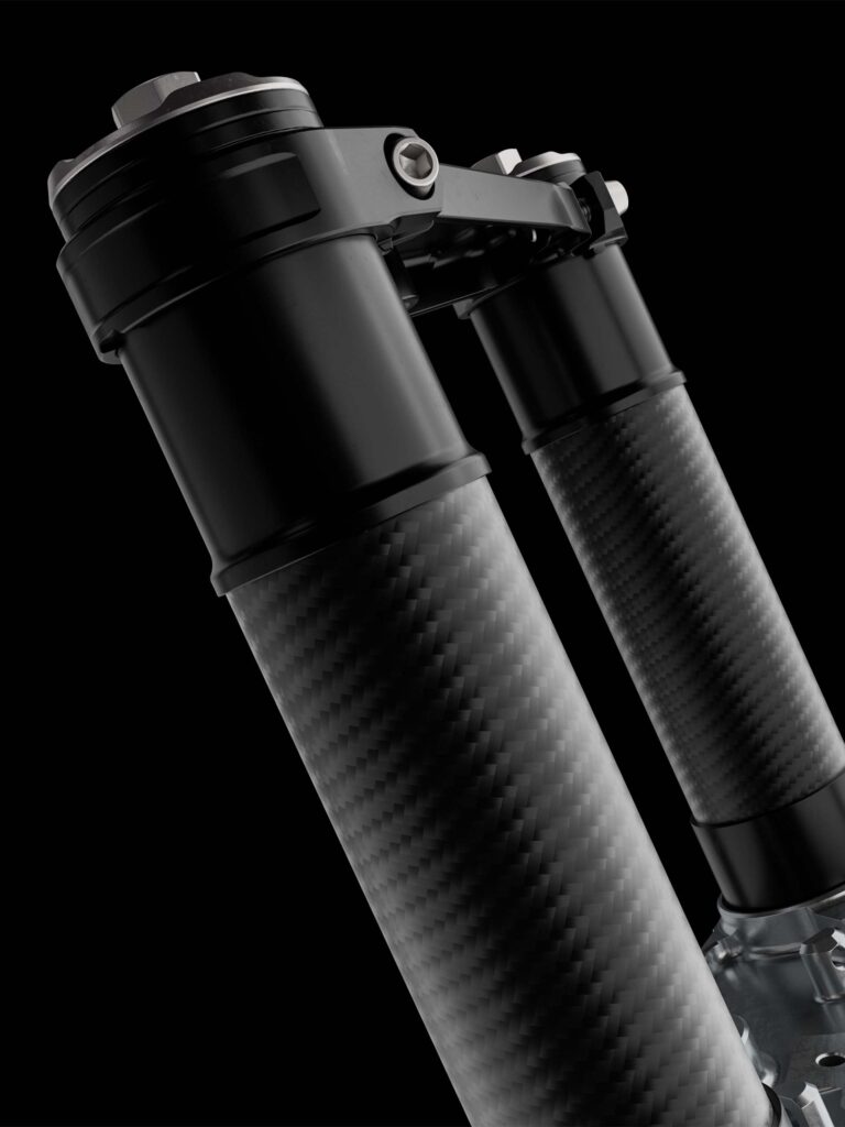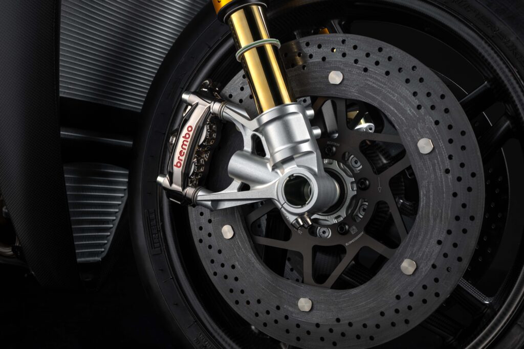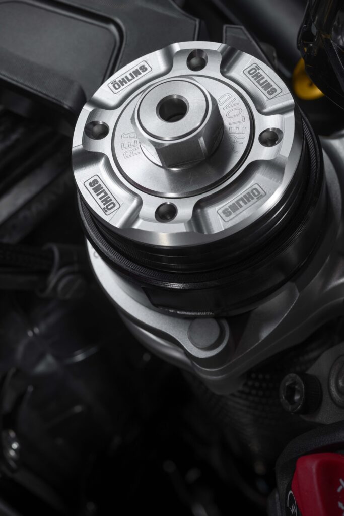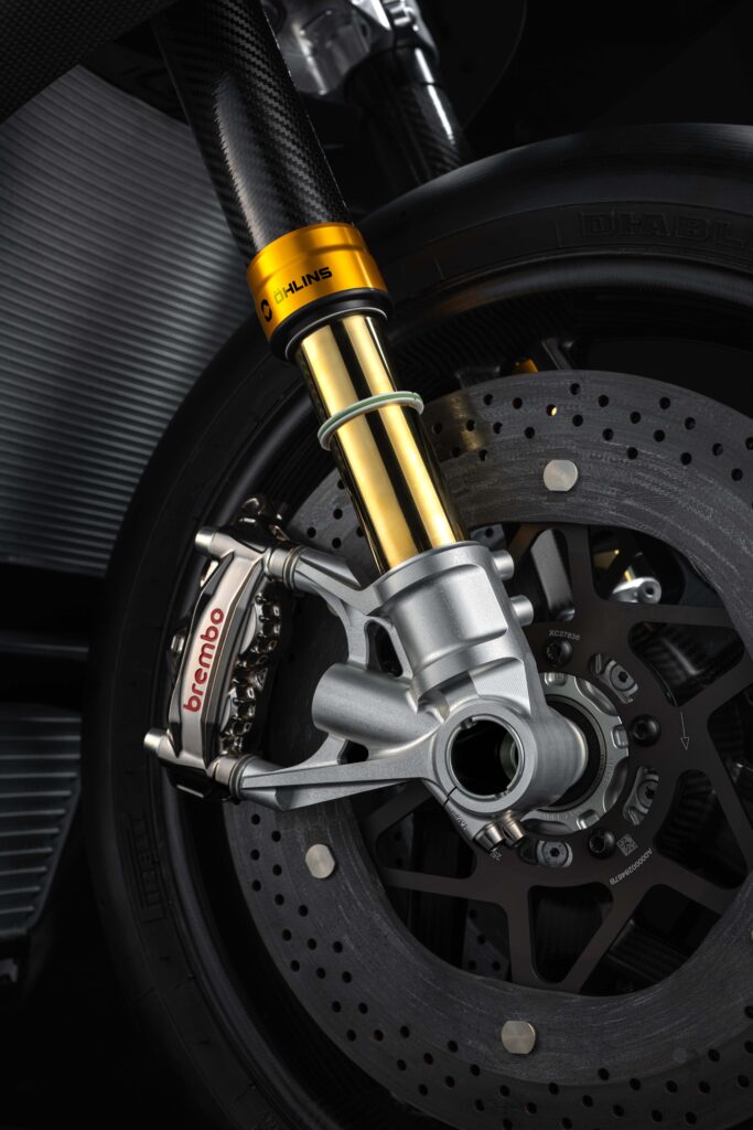 Affjedringen er hentet fra øverste hylde hos Öhlins med en NXP25/30 tryksat upside down-gaffel med føromtalte carbon-ben og en TTX36 GP LW bagdæmper med særlig letvægtsfjeder. Samme eksklusivitet ses på bremsebestykningen med Brembo GP4 HY-calipere på keramiske 340 mm Hyction-skiver.