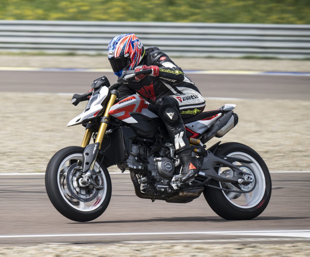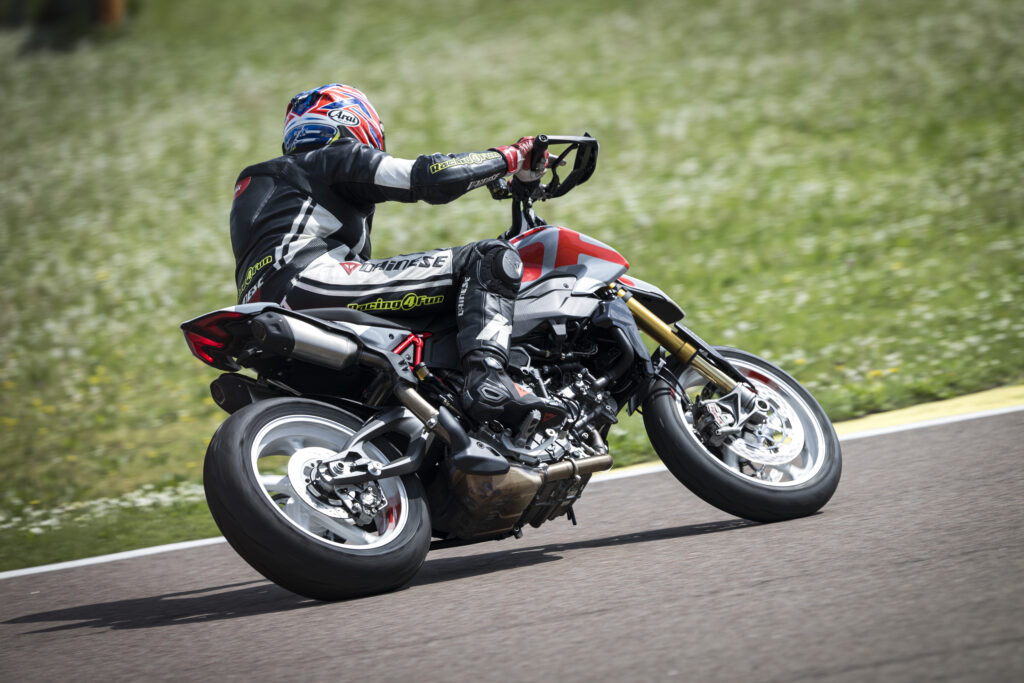 Bremserne matcher med Brembo’s M50-calipere og 320 mm-skiver på forhjulet, suppleret af en fintfølende ABS med kurvefunktion. Systemet har desuden Slide by brake-funktion, så vildbasser i fuld kontrol kan bremse sig sidelæns ind i svingene. Elektronikken rummer derudover power- og ridingmodes, traction-, wheelie-, launch- og cruise control, motorbremsestyring, tovejs quickshift og pit limiter. De mange features styres via Hypermotard’s 5” TFT-skærm, der kan servere informationerne i de tre info-modes Road, Road Pro og Track.