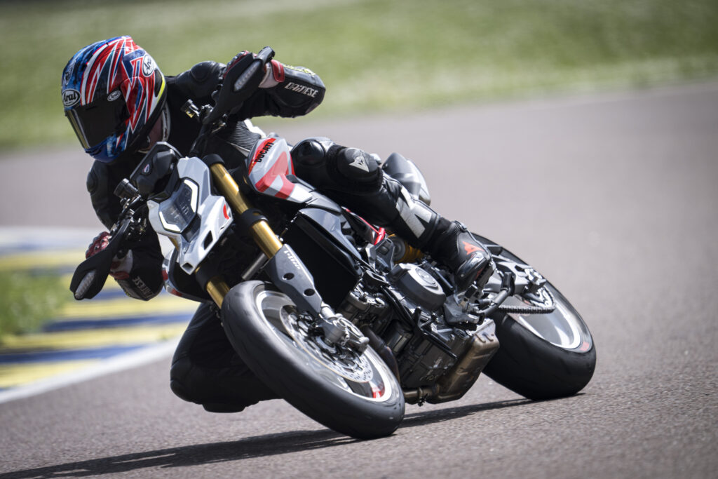 Vægtbesparelsen skyldes både den nye 890-motor og monocoque’en i alu, som har afløst forgængerens rørgitterramme i stål. Den næsten ekstreme styrevillighed passer perfekt til de mange snævre 2.-gears sving, men samtidig er stabiliteten god ved højere hastigheder. Öhlins-affjedringen giver virkelig fin føling med grebet i de originalmonterede Pirelli Rosso IV Corsa, som inden kørslen er lunet op med dækvarmere i pitboksen.